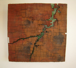 2017brown, red grid ceramic with green glas. The light falls through the "lightning", it is fixed to a suspension that leaves it hovering 10 cm in front of a wall.
